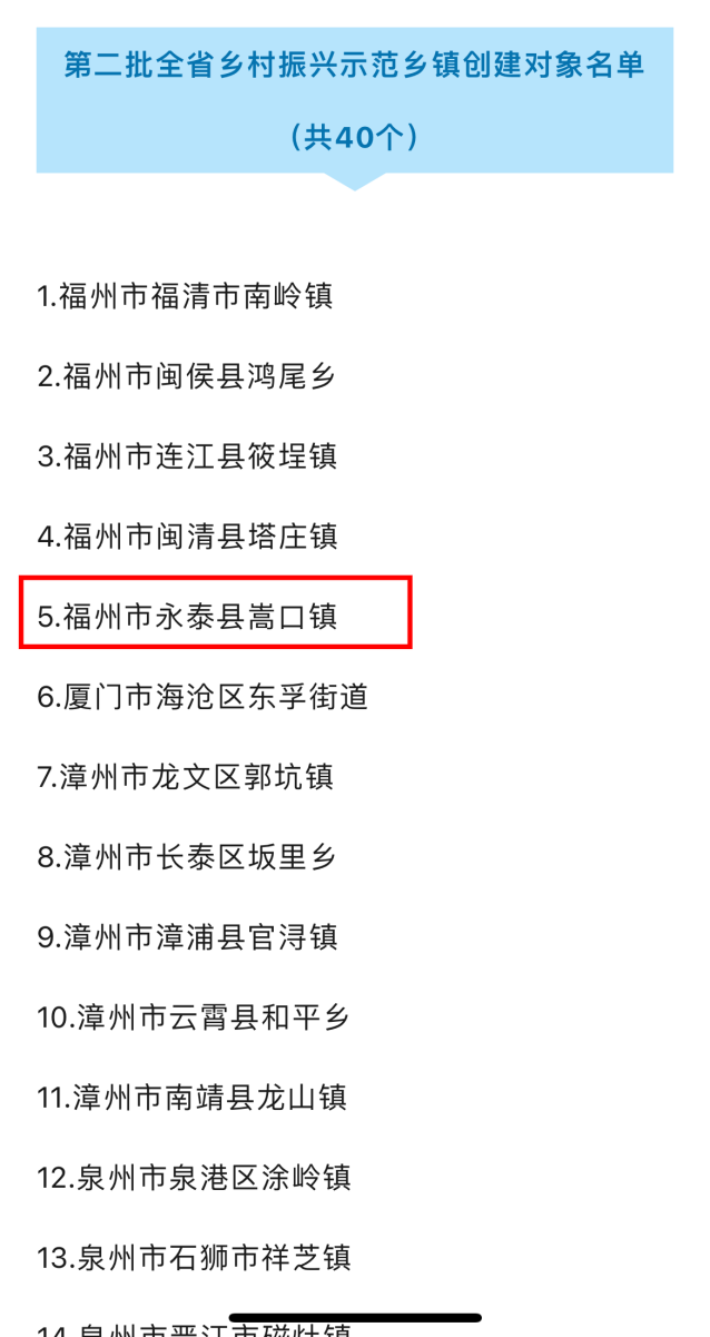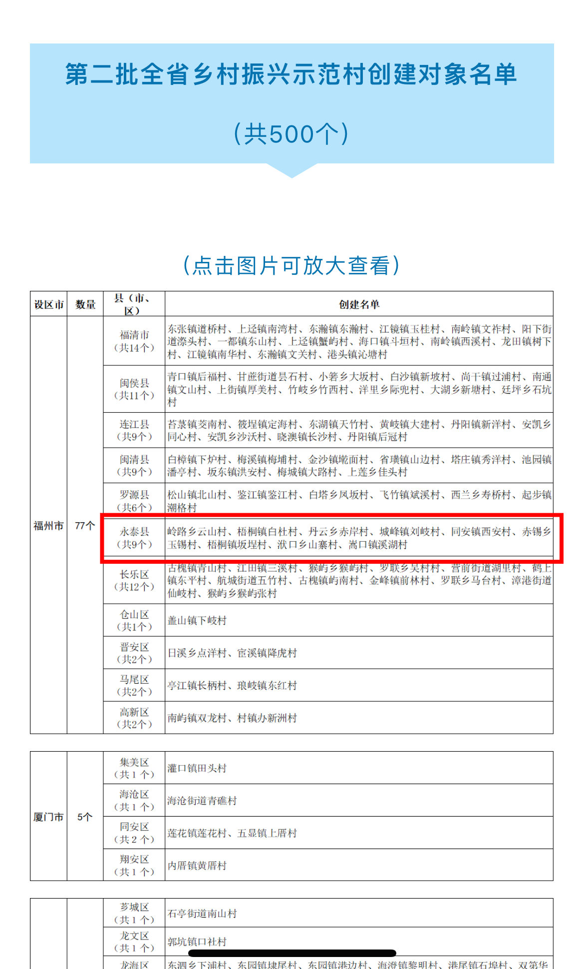 日前,福建省农业农村厅、福建省乡村振兴局发布通知,公布了第二批全省乡村振兴示范乡镇、示范村创建对象名单,共40个乡镇、500个村,其中,永泰县有10个上榜,分别是:永泰县嵩口镇获评第二批全省乡村振兴示范乡镇,岭路乡云山村、梧桐镇白杜村、丹云乡赤岸村、城峰镇刘岐村、同安镇西安村、赤锡乡玉锡村、梧桐镇坂埕村、洑口乡山寨村、嵩口镇溪湖村获评第二批全省乡村振兴示范村。