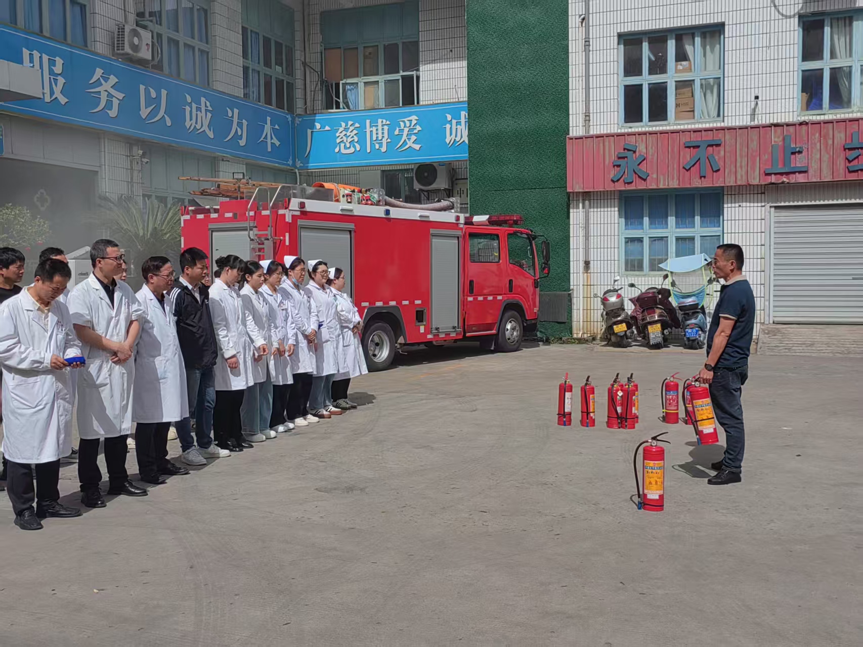 会前,圣德医院组织全体人员参与消防应急演练,其余参会人员现场观摩学习。演练模拟医院病房突发火情场景。工作人员分工明确、配合默契,迅速、有序地完成了火灾报警、人员疏散、转移伤员、初期火灾扑救等各个流程,并进行消防设施实操演练,进一步检验了医院的消防应急处置能力和协同作战能力。演练结束后,县消防救援大队现场点评演练情况并作针对性指导。