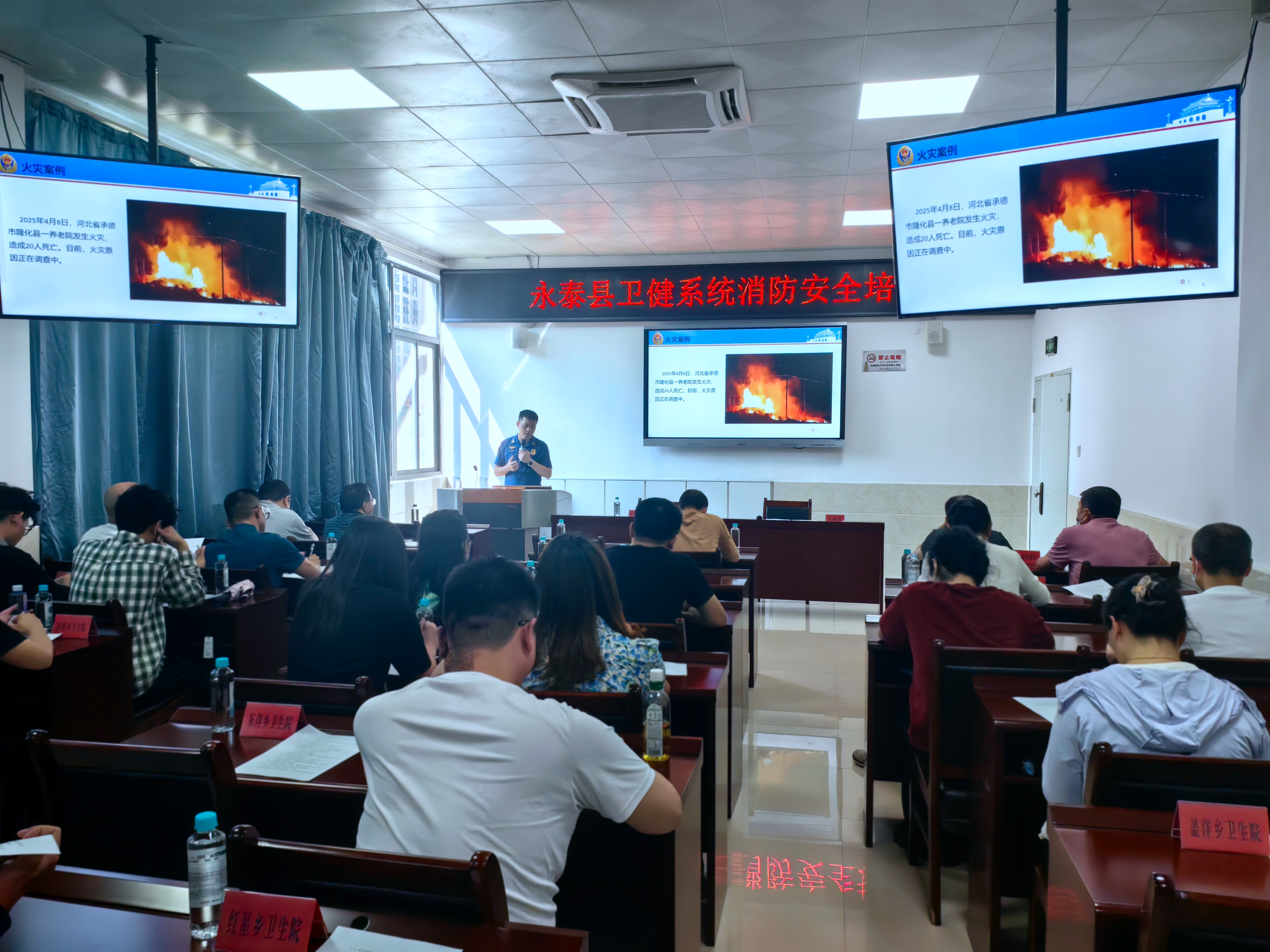 演练结束后,县卫健局召开消防安全培训会。消防救援大队教员结合近年来医疗卫生机构发生的典型火灾案例,详细讲解了消防法律法规、火灾预防、初期火灾扑救、火场逃生自救等方面知识。