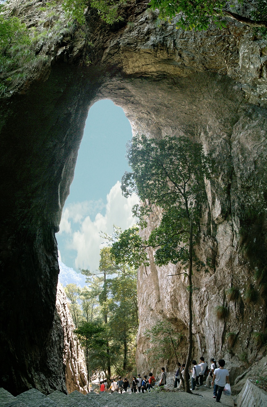 天门洞,山中一巨石屹立形状如门,石门高13米,宽7米,位于峰顶奇特无比的火山岩顶,在其周围还有天门寺,为明朝遗迹,诗曰:“漫游心比定禅闲,世网由来百不关。诸佛无言狮自伏,九阊如绣藓为斑。断崖窍石延斜日,隔港迷云失好山。兜率宫中今借住,叩阍已入翠微间”设于洞穴,避风挡雨,其后有日月天窗。有人称之日洞、月洞。