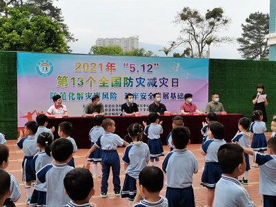 开展防震减灾应急疏散演练。演练现场,学校模拟当地震来临时,幼儿园立即启动应急预案,组织学生采取正确避震措施。学生们在老师引导下,先是做就地避震,随后因震感加强时立即紧急疏散至操场,同时对疏散过程中发生的意外事故的应急救护。整个演练过程中,全体师生通力协作,默契配合,圆满完成了预设项目。