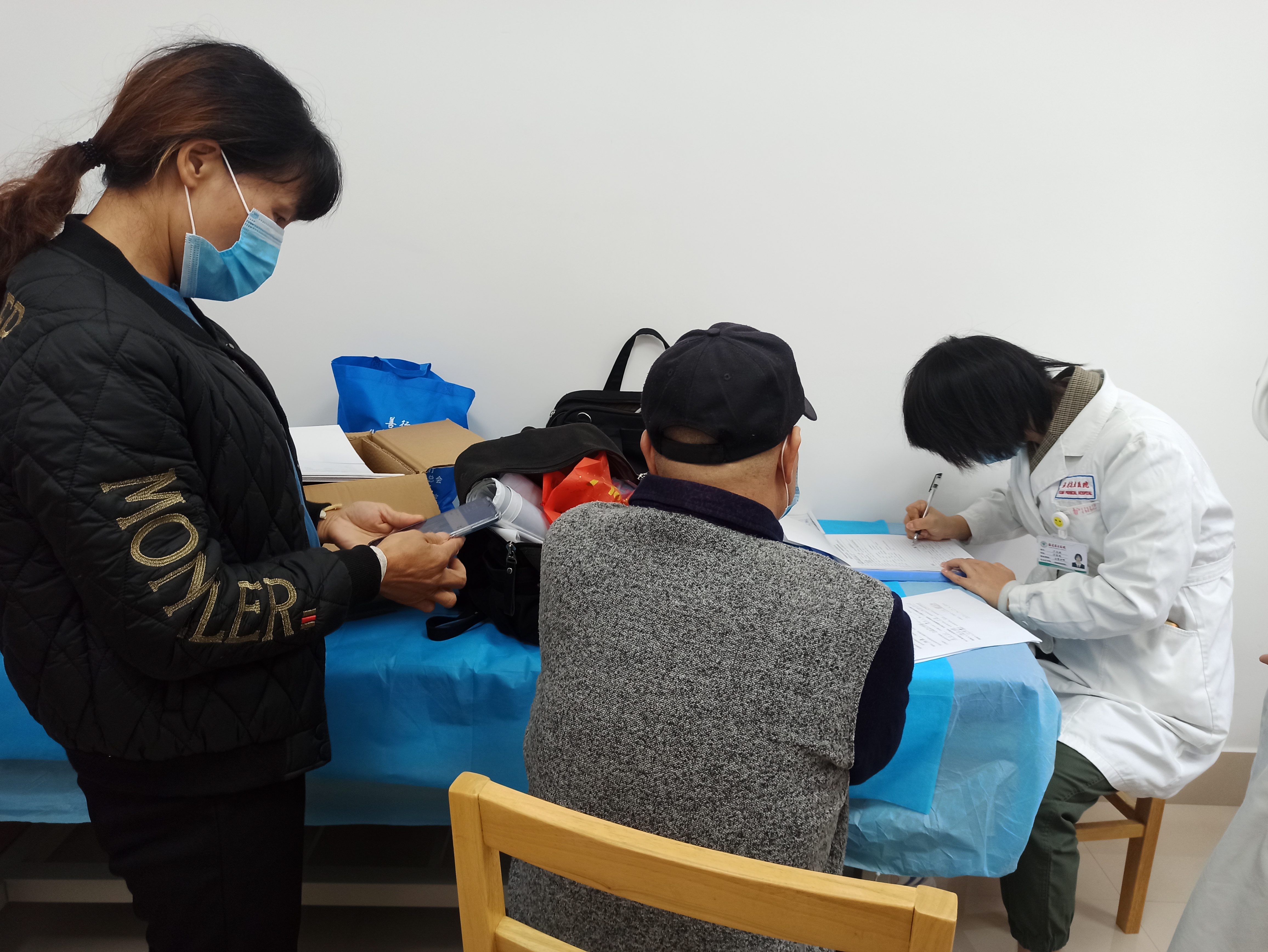 活动现场,医疗组认真询问患者的身体情况、治疗情况以及后期如何取药,收集患者材料。他们还为患者详细讲解了安宁疗护的含义、免费范围和主要对象等。