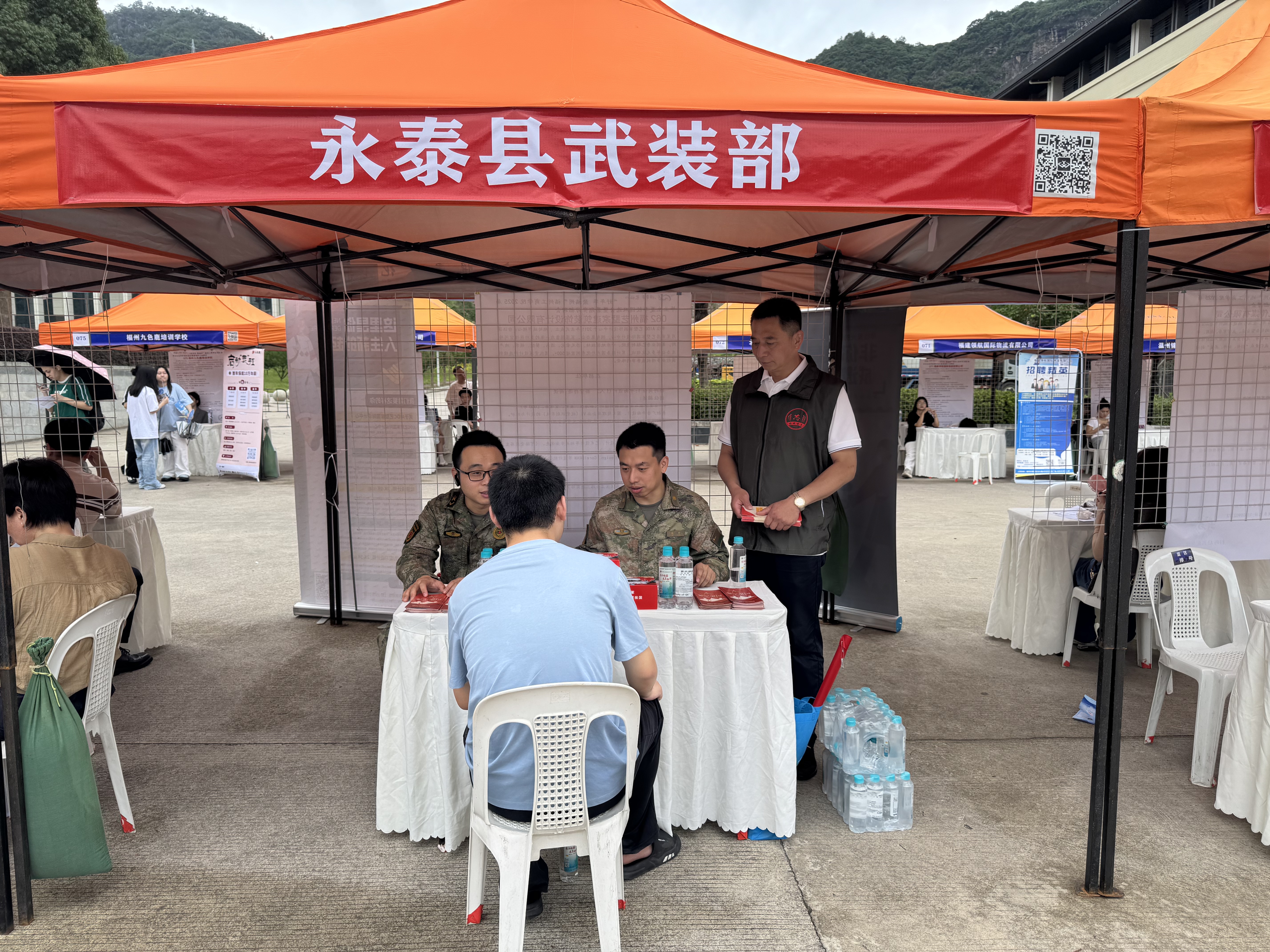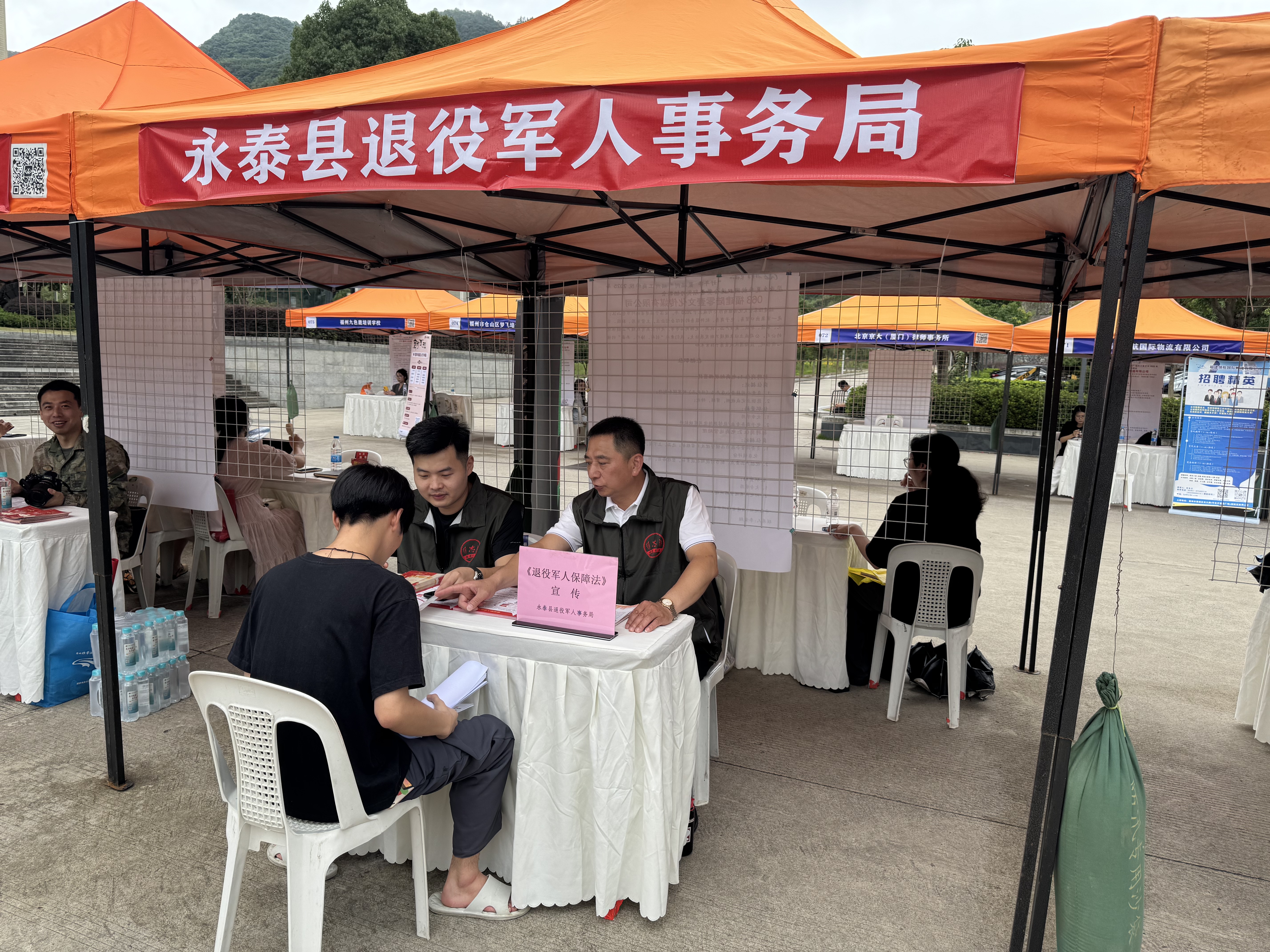 活动当天为福州工商学院夏季校园双选会暨暑期实习招聘会,吸引了大量毕业生前来现场。永泰县退役军人事务局工作人员通过拉横幅、设置咨询台、发放折页的方式吸引校园师生前来驻足询问。工作人员围绕《退役军人保障法》展开细致解读,结合退役军人就业创业扶持等社会普遍关注的问题,通过“法条+实例”的方式,让学生们了解退役安置、就业创业、待遇保障、抚恤优待等政策规定。同时,现场还联合县人武部进行了征兵动员,鼓励他们积极行动起来,踊跃报名参军,通过履行兵役义务实现自身建功立业、保家卫国的青春梦想。