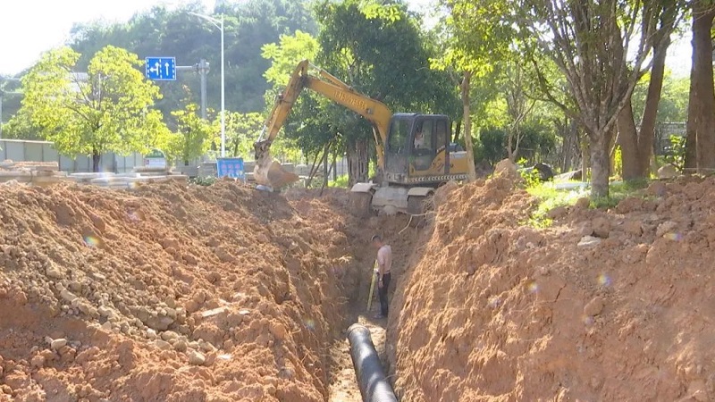 记者在榕树公园周边景观提升项目施工现场看到,两台挖掘机开足马力进行推土、搬运、填埋等作业,建设工人们则铆足干劲,进行管道预埋作业。
