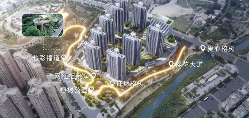 该项目由银汤路(樱花大道)、榕树公园和星光福道三部分组成,园区内设置有许愿榕树、相亲角、七彩福道等板块。
